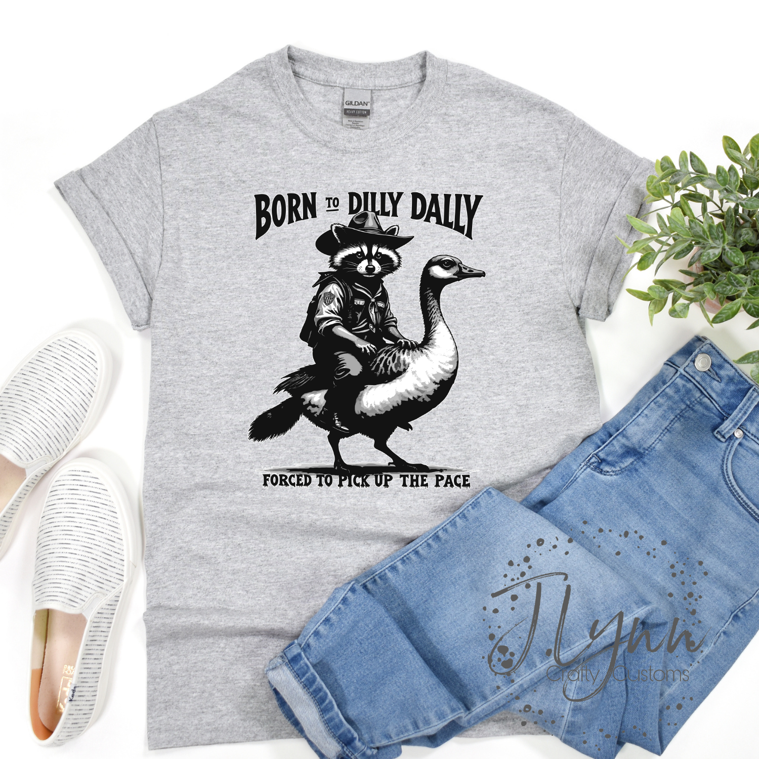 Embrace your leisurely nature with the Born to Dilly Dally T-Shirt. This playful tee features a fun raccoon riding a duck, making it perfect for those who love to take things slow but are forced to pick up the pace. Embrace the dilly dally lifestyle in style!