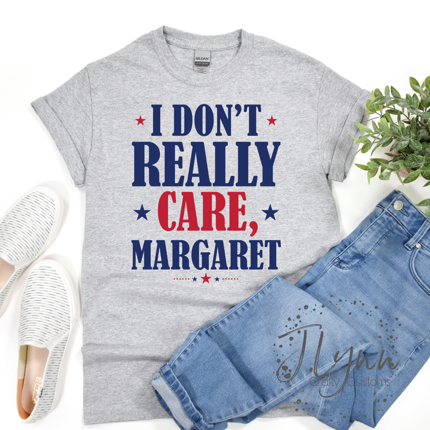 Channel your inner rebel with the "I Don't Really Care Margaret" gray Gildan t-shirt. This humorous and patriotic shirt will show off your playful and quirky side while making a statement. Perfect for those who don't take themselves too seriously.
